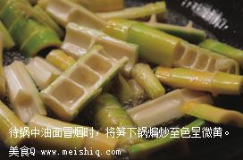 待锅中油面冒烟时,将笋下锅煸炒至色呈微黄。