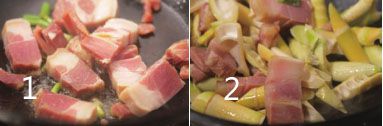 入咸猪肉、笋一起煸炒,让笋均匀沾满底油。