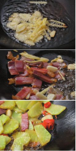锅内倒入底油烧热,放入蒜片、姜丝爆香,放入红椒、火腿片,翻炒至变色。