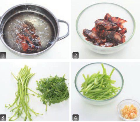 腊肉在水中煮 8~10 分钟,取出洗净后腊肉切片。