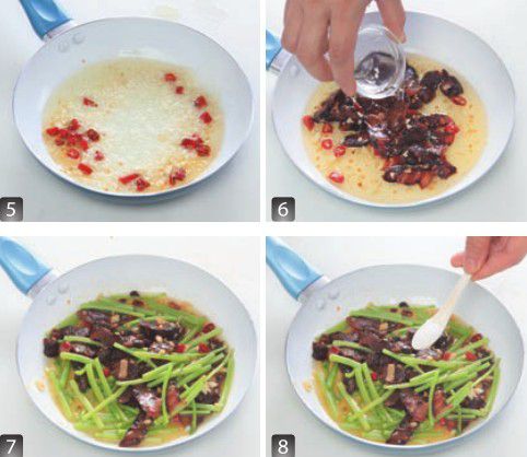 爆锅中放油,烧至六成热时放入蒜末、干红辣椒爆香,再放入腊肉炒 2 分钟至微焦,然后放 1 汤匙清水焖片刻。