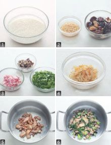 大米淘净后浸泡 2 小时,沥干水分。芥菜洗净切小段,五花肉洗净切小片,香菇泡发后洗净切丁,虾皮浸泡 30 分钟后沥干水分备用。