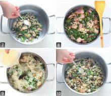 将锅置旺火上,放入油烧热,下五花肉片煸炒至熟,加入香菇、芥菜、虾皮和盐再炒半分钟,加入淘洗过的大米、生抽拌匀整平。