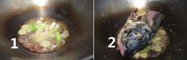 大锅下重油,烧热,入葱、姜、蒜、花椒、八角爆香,下入东北大豆酱炒匀,入胖头鱼双面煎至变色。