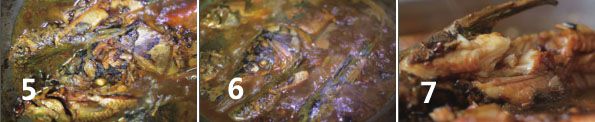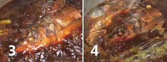 下入鲫鱼和嘎牙子,加醋去腥味儿,再加入适量酱油、盐、白糖,大火烧开,转小火炖 20 分钟,汤汁收浓即可出锅装盘。