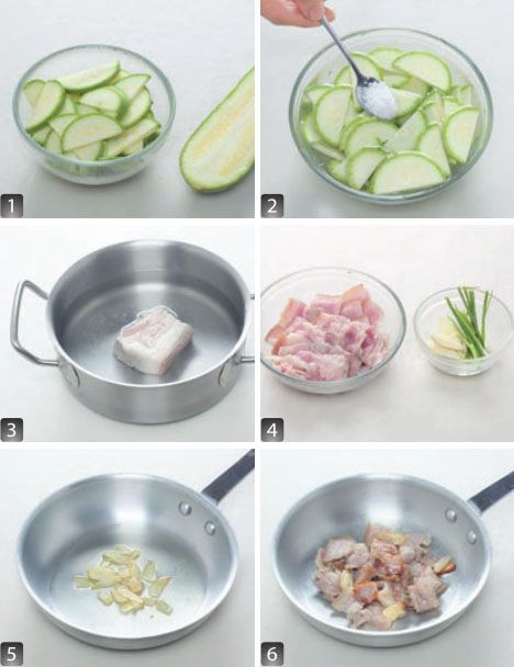 西葫芦洗净切成片,放入盐水中浸泡 5 分钟换清水洗净,沥干水分。五花肉放在冷水中,加热煮沸半分钟后取出,洗净冷却后切成薄片。葱切葱段,大蒜去皮切片备用。