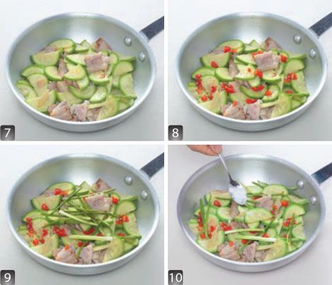 锅中放油,烧至六成热时放入蒜片爆香,放入五花肉片,调至中大火炒至微焦后放入西葫芦片大火炒 1 ~ 2 分钟至熟。