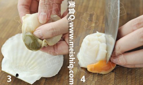 将扇贝的外壳掰开,用刀将扇贝肉片出,去掉黑色的沙包。