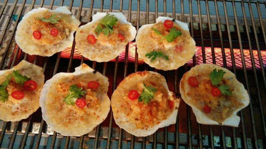 把扇贝放到炭炉上烤到扇贝肉焦黄。