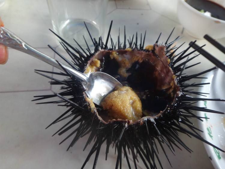 这儿常见的吃法就是:海胆刺身生食,和海胆蒸蛋熟食两种。生食时,要在海胆壳顶端锯出一个切口,然后从切口中小心地取出所有的海胆内脏,留下完整的海胆黄,吃时淋上柠檬汁、特制生抽汁或者辣芥酱,拿起海胆轻轻摇匀,让调味汁充分浸透到海胆四周后,用小勺舀起吃,冰凉爽滑没一点腥呛味,非常的鲜美。另一种就是家庭里简单易做的海胆蒸蛋咯,在六七成熟的蛋羹上遢上海胆黄,再蒸到海胆黄变色变硬,就可以吃了,海胆黄无骨无筋入口即化,鲜美凌厉的感觉,享受美食的同时,唇齿间还会留下如同海洋般甘美清甜的气息~