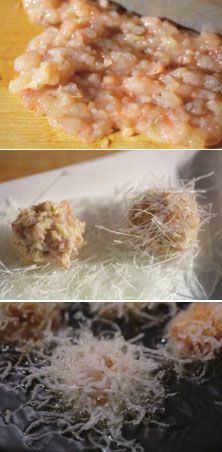 将虾去头去尾去虾线,剁成蓉,加入盐、酱油、淀粉、姜末,顺着一个方向搅拌。搅拌均匀后,用手攒揉成小丸子,沾满粉丝碎。