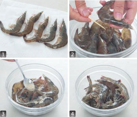 大虾洗净,用厨房用纸吸干水分。沿着虾的背部剪一道长口,挑出虾线,用白胡椒粉腌渍一会儿,表面均匀撒上一层很薄的干淀粉,静置 2 分钟。柠檬切块备用。
