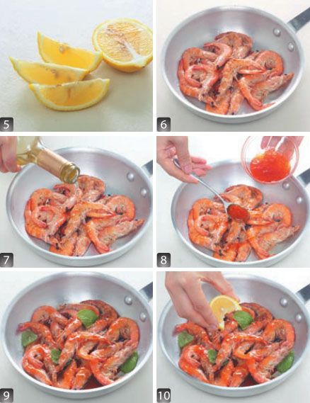 开中火,倒入油烧至六成热,放入大虾煎至两面变色的同时撒入蒜末炒出香味,立即炝入白葡萄酒增香,调入甜辣酱、生抽炒匀,再撒上鲜罗勒叶加盖焖烧 2 分钟,揭开锅盖等汤汁基本收干,挤上柠檬汁微煮一会儿即可。