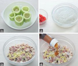 将猪肉、豆腐、香菇、姜混合在一起剁成泥,加入香油、盐拌匀做成馅料一起填入丝瓜盅内压紧。