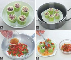 将丝瓜盅摆在粉丝上入锅蒸 20 分钟。另起锅加油烧热,放入葱花和红辣椒一起翻炒 2 分钟,加入料酒炒匀,最后一起浇在丝瓜上。
