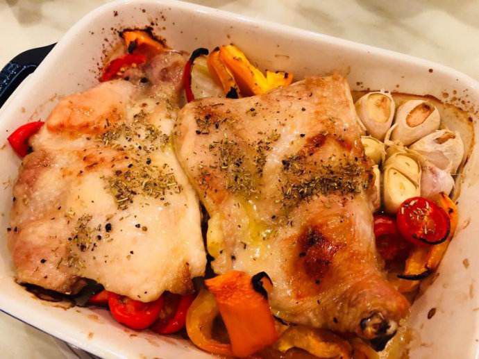 烤箱预热至200°C。然后把橄榄油均匀的抹到无骨鸡的全身、放入烤箱15分钟。在小炒锅,爆香大蒜油,待用。关火后在蒜油里放入红糖。