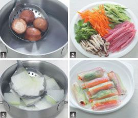 香菇泡发,过沸水汆烫 1 分钟捞起,切成丝。火腿切丝,胡萝卜、黄瓜去皮切丝。香菜洗净切段备用。