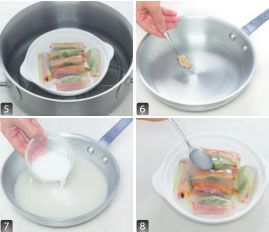 将冬瓜卷隔水蒸 3 分钟,另起一锅,加水烧开,放盐、鸡精化开,加水淀粉勾芡做成汤汁,最后淋在冬瓜卷上即可。