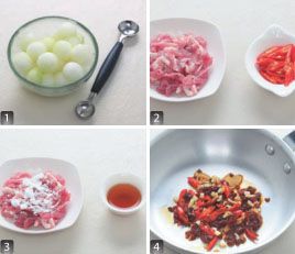 冬瓜洗净去皮,用勺子挖出冬瓜球,红尖椒切段。猪肉切丝,用适量淀粉和料酒拌匀腌渍片刻。