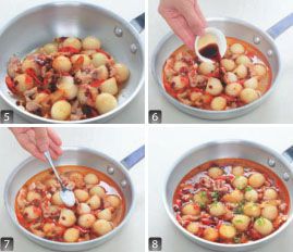 下冬瓜、肉丝翻炒 2 分钟,倒入少许清水烧开,加酱油、白糖,小火炖 3 分钟。再加盐调味,用水淀粉勾芡,最后撒上葱花即可。