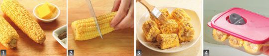 玉米上抹上黄油、盐和黑胡椒粉。然后放入微波炉专用容器中,高火约四分钟后取出,将玉米翻个再次高火约四分钟即可。