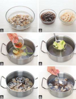 锅中放水,倒入葱姜片、料酒,水开后捞出葱姜不要,放入蛤蜊、藕片、海藻。小火煮 5 分钟,调入盐、鸡精即可。