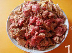 牦牛肉洗净后切成两块,用调料、食盐、料酒、姜、葱段码味4~6小时。