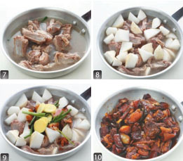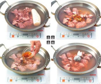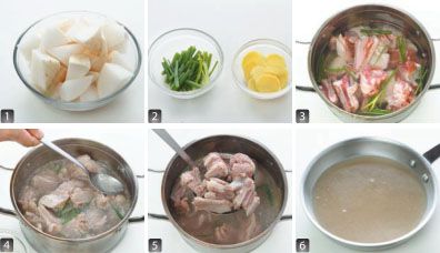 往锅里加羊肉汤,烧沸后加入羊排、萝卜、老抽、盐、料酒、八角、桂皮以及剩余的姜片、葱段,大火烧开后用中火煮 30 ~ 40 分钟至肉软烂,收汁后盛出即可。