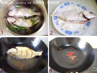锅中倒入食用油,烧至5成热,下入黄鱼煎炸,炸制两面金黄捞出。