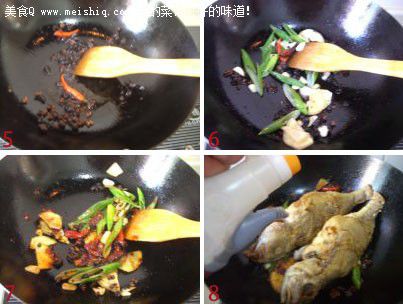 下入豆豉煸炒。接着下葱姜蒜片煸炒出香味。下入一勺红油豆瓣酱煸炒出红油。