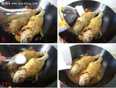 加入糖,盐。加入适量的温水。盖上锅盖,中小火焖煮。当汤汁盛少量时关火。