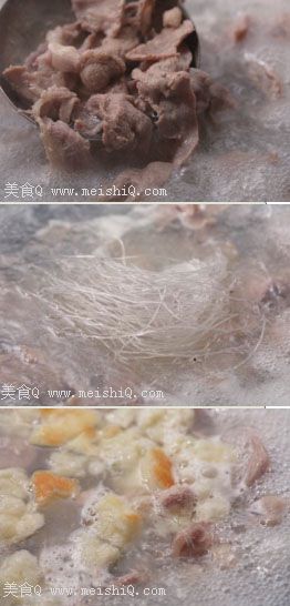 另起一锅,锅中盛入炖羊肉的原汤,放入粉丝、木耳煮熟,加盐调味,粉丝、木耳熟后,出锅倒入碗中。