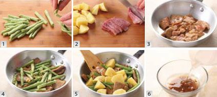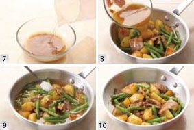 加入扁豆、葱段和姜块一起翻炒,等到扁豆炒软了之后,将土豆放入翻炒。将调味汁放入锅中,加适量热水没过食材,再加入葱段、姜块、白砂糖、鲜味酱油、料酒、五香粉,烧煮至收汁即可。