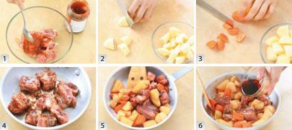 锅中放油烧至五成热,也就是手掌放在锅上方可以感到明显热气的时候,放入小排煸炒 1 分钟左右,然后放入土豆、胡萝卜和葱花翻炒。加入盐、鲜味酱油翻炒均匀后盛出。