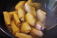 锅里水煮沸,放入鸡翅焯至表皮变色即可。洗净鸡翅表面的浮沫后,沥干。