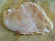 鸡胸肉用刀背拍一下,切成大拇指甲大小的丁。