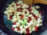 放入干辣椒,葱和一茶匙花椒粉,炒出香味。