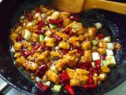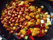 鸡脯肉切丁,加入少许的盐、蛋清、白胡椒、料酒搅拌均匀。将酱油,白糖,醋,味精,清汤,水淀粉调成芡汁。干红辣椒切成2厘米长的节。花生米用油炸脆,将干红辣椒,花椒炸至棕红色,将鸡丁炒散,放入姜葱蒜炒匀,烹入芡汁,加花生米翻两下装盘即可。