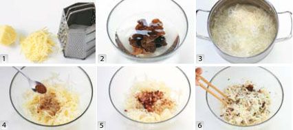 加入 1/2 茶匙盐、花椒粉和白胡椒粉,再放入腊肉碎,加面粉、木耳碎、香菜碎搅拌均匀,然后用手捏成丸子,装入盘中,上锅蒸 7~8 分钟至熟,盛出备用。
