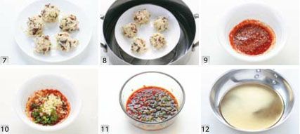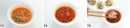 将辣椒粉用 2 茶匙生油稀释拌匀,然后将青红椒碎和剩下的盐、糖、鸡精、醋、鲜味酱油制成调味汁。
