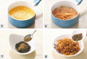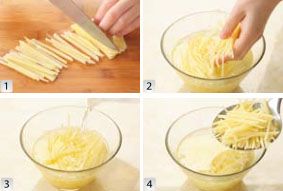 切好的土豆丝放入清水中浸泡片刻,然后冲淋漂洗 2~3 遍,沥干水分备用。注意一定要充分沥干,否则一会炸制的时候会油星四溅。