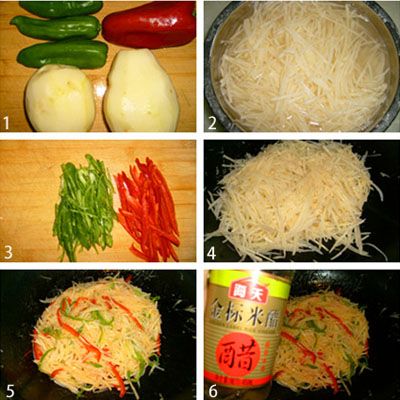 土豆洗净,切丝,青、红椒洗净切丝。