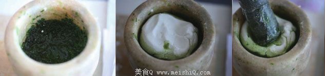 将糯米粉和粳米粉混合加上糖,倒入煮熟捣碎的艾叶。