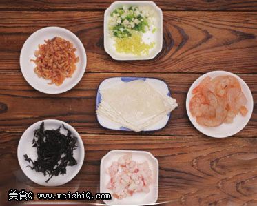 鸡蛋2个取蛋清,小葱,切葱花。将虾仁、肥肉馅、蛋清、盐拌成馅料,其间加清水 2 次,直到所有水分都吸收进去。