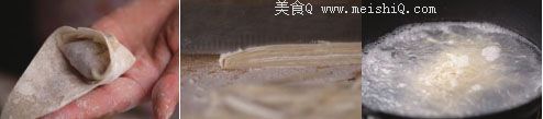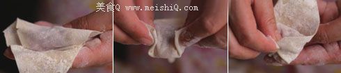 一张云吞皮放在手心,用筷子从碗里挑一点馅放在云吞皮的一角,然后用手把云吞皮慢慢沿对角卷起,卷到皮的中间,就把卷起的两边角向里折并用手捏紧。
