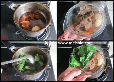 取适量卤汁, 放入切好面的牛肉和鸡蛋;煮开后将它们捞出;放入几颗洗净的小白菜;烫开后也捞出;