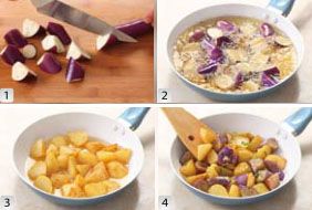 锅中放油烧至六、七成热,即手掌在锅上方可以感觉到很明显的热气时,将茄子放入,大火炸制,炸至表面微焦的时候,捞出沥油。然后再用同样的方法将土豆也炸至表面微焦后捞出沥油,或者也可以用少许油煎制土豆。