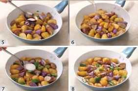 锅中留少许油,爆香葱姜末之后,放入土豆和茄子炒匀。然后加入生抽、鸡精翻炒均匀,加入约150ml 清水大火烧至收汁,此时茄子熟烂、土豆会变软一些,加入糖、盐。