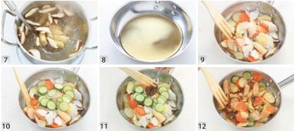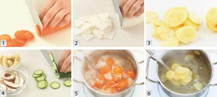 将白萝卜、胡萝卜分别去皮洗净,切成片备用。土豆去皮洗净,切成片。注意尽量让所有食材的片都差不多大。玉米笋冲洗一下,切成小段备用。