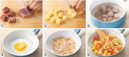将土豆去皮洗净后,切成小丁,放入清水中浸泡备用。牛肉泡净血水后,切成小块,和土豆等大就可以。锅中放入适量清水煮沸,加入香叶,然后将牛肉放入锅中煮至熟烂。利用煮牛肉的时间,将番茄、胡萝卜分别洗净,然后分别切成同样大小的碎方丁。洋葱、圆白菜分别切丝。